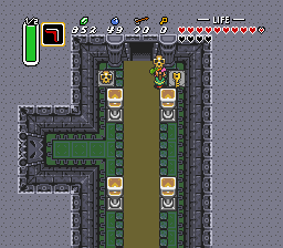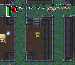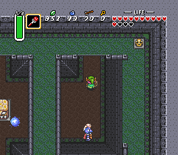 此处有一只Rabbit Beam,你可能会暂时变成兔子。继续向南进入下一屏。爬上南侧的台阶回到高台,然后再次从西南角跳下。向左走一屏,打开宝箱获得大钥匙。