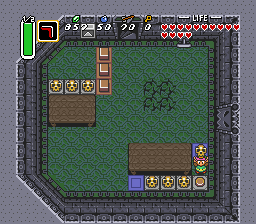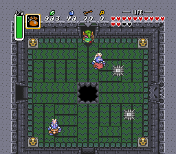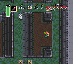 掀开罐子获取一些补给品,穿过敌人继续前进至下一房间。如果你愿意,可以对反妖精撒些魔法粉末,然后继续向左前进。冲刺到房间顶部并向上进入下一屏。掀开骷髅头获得一把小钥匙。在通过上锁门前,务必击打水晶开关,确保蓝色方块已降下。