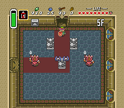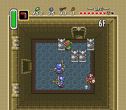 进入海拉鲁城堡高塔后,向上移动一屏,你会遇到一对金色铁球兵。这些敌人的生命值比我们在游戏早期遇到的灰色铁球兵更高。使用回旋镖暂时使其眩晕,再用剑进行攻击。击败两者后,继续向右移动一屏。