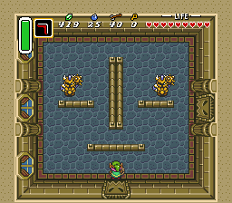 这个房间有一对红色长矛兵和两只查苏帕。房间中央的长矛兵持有一把小钥匙,因此掀开罐子并击败他。继续向右移动一屏,你会遇到三名强力敌人。击败或忽略他们,然后走上楼梯。