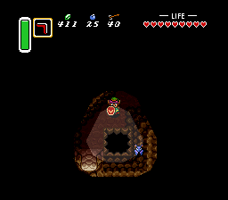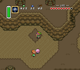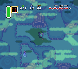 由于你现在拥有月之珍珠(Moon Pearl),会保持林克的正常形态。再次向西走一点,在之前使用魔法镜子(Magic Mirror)的位置再次使用它,返回光明世界。从北边较高的悬崖跳下,即可来到赫拉之塔外。