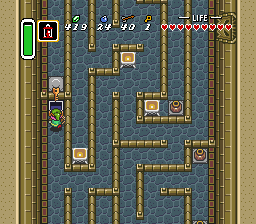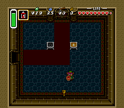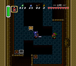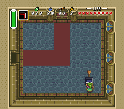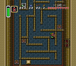 下一个房间还有另一名剑骑士和一只查苏帕,但由于房间很暗,它们很难被发现。击败或避开它们,然后向左移动一屏。下一个房间是一个迷宫,里面充满了蓝色剑兵和查苏帕。向上、向左,再向下走,直到看到一个火把。使用提灯点燃它,以便看清房间内的情况。房间西侧有一个宝箱,里面装着一把小钥匙,务必拾取。前往房间的东南角,然后向右走。