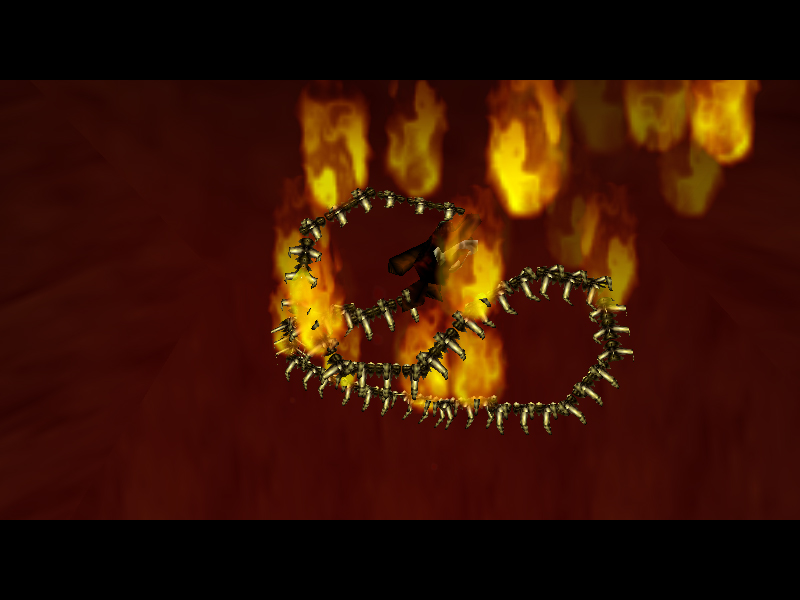 要伤害它,必须等它在发动攻击前短暂静止的瞬间。当它旋转时,按Z键锁定它,然后投掷炸弹或使用钩索暂时剥离它的火焰躯体。此时它会变成一个黑色躯干,长出细小的腿,在房间里吱吱叫着乱跑。它会绕房间转圈,看到你后又转身朝反方向跑,如此反复。最终,它会跳回火焰中。