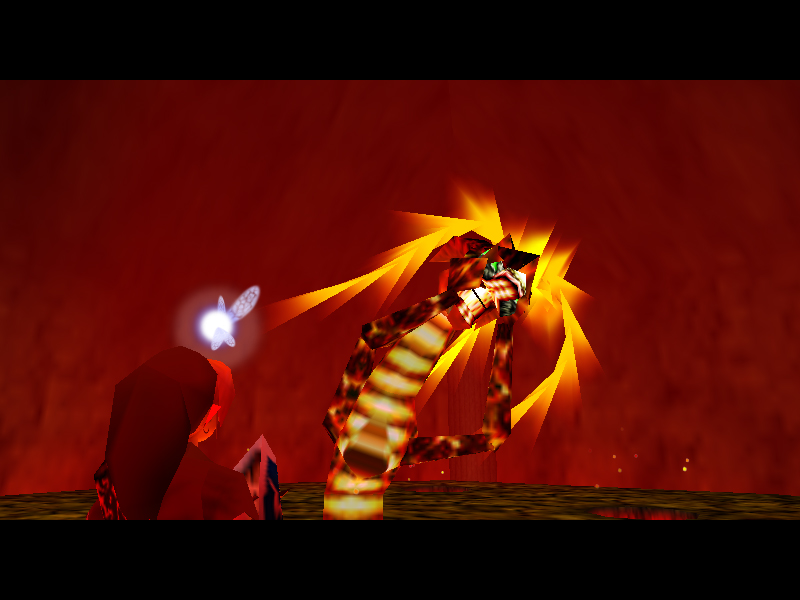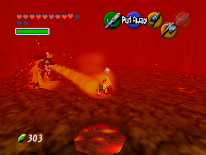 第二种攻击是从岩浆中钻出并在竞技场内飞行,试图对你喷火。此攻击伤害极高且会将你击倒(可能掉入下方岩浆),但只需站在它最初钻出的洞口旁即可轻松躲避;原因在于它的转弯半径很大,且愚蠢到不会直接后退。或者,你也可以像无头苍蝇一样绕圈奔跑,或按Z键锁定它并举盾。我个人认为站着不动更容易。=)