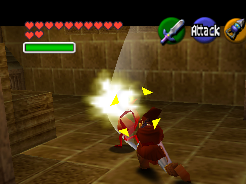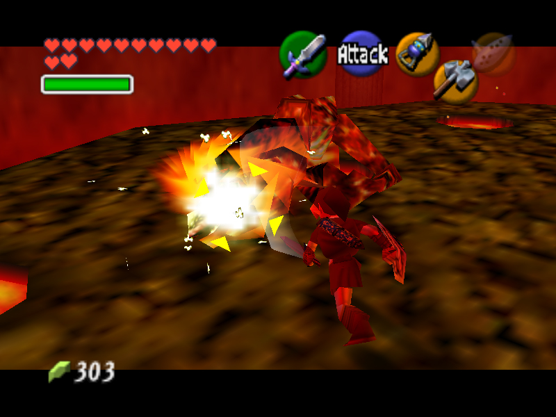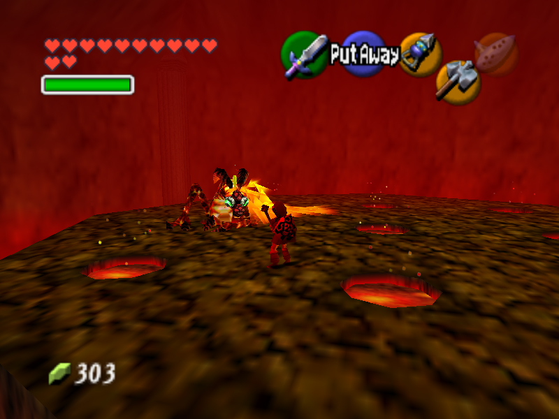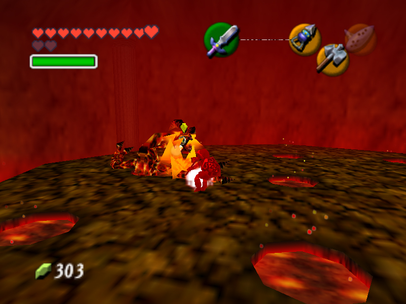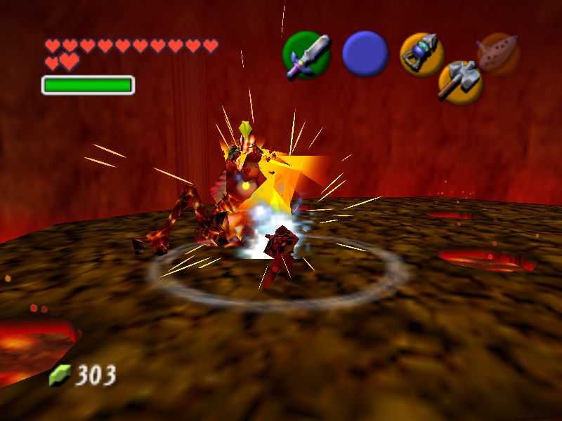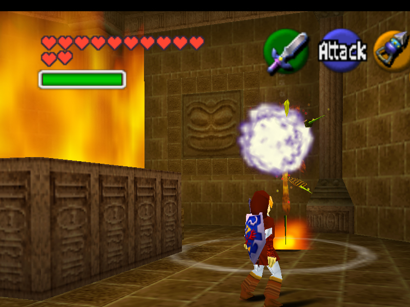 战斗一开始,敌人就会从火焰中跳出并开始旋转。如果你不迅速阻止它,它会向四周放射火焰。它有两种火焰:红色火焰会静止不动,蓝色火焰则会像《塞尔达传说:林克的冒险》中的那样缓慢地在房间内移动。