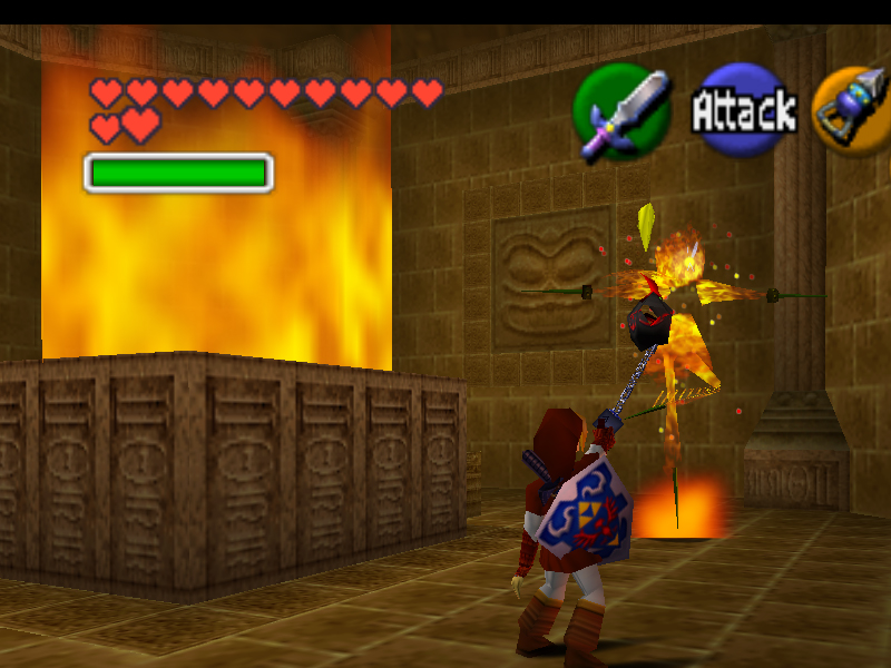 现在,前往北端。升起的钩索靶点应能让移动更轻松。靠近西墙的北侧某个平台会震动,然后突然向上弹射而非下沉。跳到带罐子的小壁龛(内含魔力),用“迪恩之火”点燃此处的火把。迅速将箭矢穿过火焰,射向下方左侧栅栏门旁的火把以解锁。跳下去,通过下方的门,救出一名鼓隆族人以换取一只金色蜘蛛(Golden Skulltula)。回到外面,用钩索射向刚使用过的门上方平台上的靶点,然后使用上方的门。挡住迎面飞来的地砖,再用钩索穿过火焰与烈焰,取得房间另一侧的Boss钥匙。