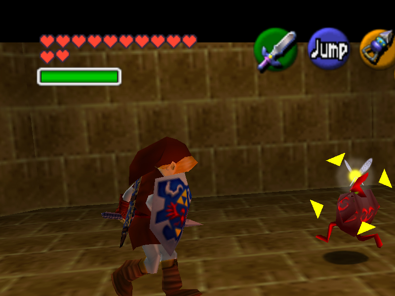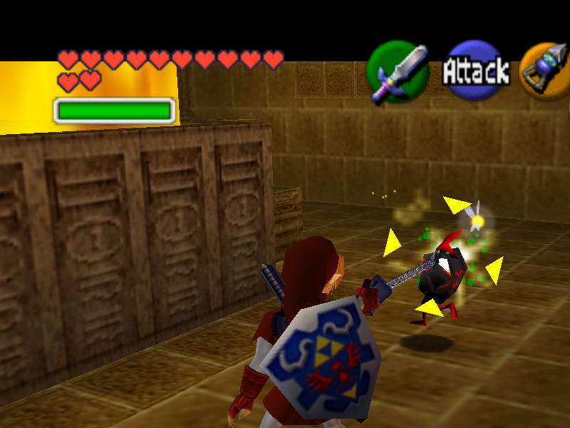 再次避开阻挡楼梯的火焰,用钥匙打开楼梯左下方的门。消灭蝙蝠(Keese),然后迎战两只史塔夫骨兵(Stalfos)。获胜后,可在房间中央演奏“太阳之歌”召唤红妖精恢复生命值(如有需要)。穿过下一扇门后,举起盾牌或闪避,直到飞来的地砖停止攻击。走向那套盔甲,会发现它其实是铁克努克(Iron Knuckle)。现在它的攻击力翻倍,可能一击致命。务必小心;使用L键锁定目标并后退。躲避其攻击,反击后再撤退。虽然它造成的伤害极高,但战斗方式与以往相同,只要你熟悉如何躲避攻击,应该不会太难。此外,炸弹鼠(Bombchu)在此战中会非常有用。