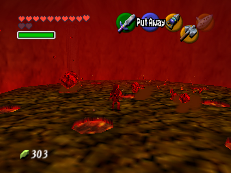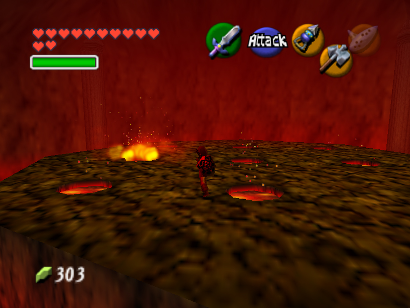 随着它受到更多伤害,它会从九个岩浆洞中出现时故意延迟,试图诱骗你跑向错误的洞口。不过很容易分辨,因为它会连续两次假装出现,第三次才是真身。最佳策略是站在中央附近,冲向最后一个洞口。由于现在踩在岩浆上不会立即受伤,你甚至可以直接走在洞口上。