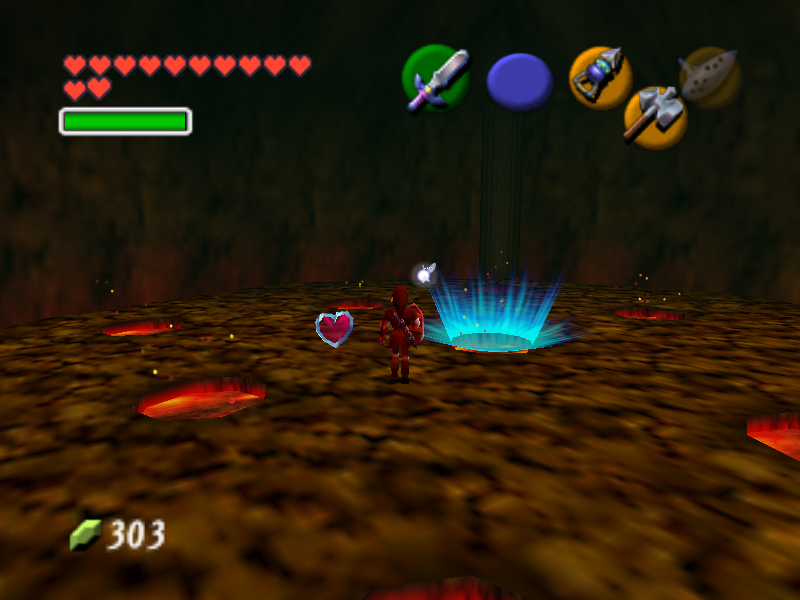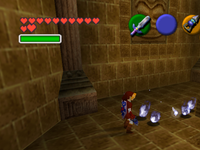 进入后,你会看到一段楼梯通向三座提基风格的雕像(只有一座是点亮的)。从楼梯右侧的门进入,一只Like Like会立刻从上方掉落并吞掉你的外衣(如果是红色或蓝色)和盾牌(如果你装备了的话),快得你来不及反应。如果它同时吞掉了两者,击败它后只会归还其中一件,因此进入此房间前务必先卸下装备。击败它后可获得一个小型宝箱,内含新的海利亚盾。(记住,如果暂时不需要,可以先不打开这个宝箱,之后随时能回来拿。)前方道路被一扇栅栏门挡住,但最好尽早解决这只Like Like,所以先返回第一个房间。