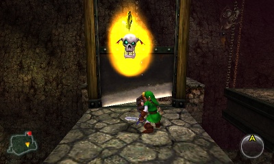 第二个骷髅房间 – 这个房间这次有三个旋转的骷髅头。如果你想,可以炸掉它们,但里面只有一些随机物品,比如魔法罐、心、箭矢和一些卢比。这个房间唯一重要的是地牢的最后一枚金骷髅蛛,藏在骷髅头后面。