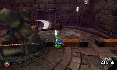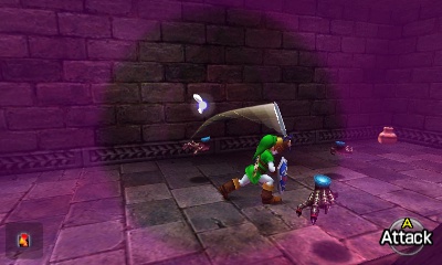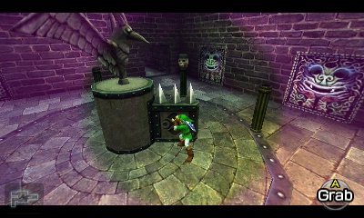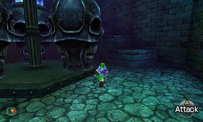 隐形镰刀房间 – 这个小型房间非常简单。地板上的圆形图案中央有一个旋转的死神雕像,但这次它是隐形的。使用“真实之眼”避开刀片,在房间内移动,消灭墙上的Keese和另一侧的Like Like。击败所有敌人后,栅栏会打开。
