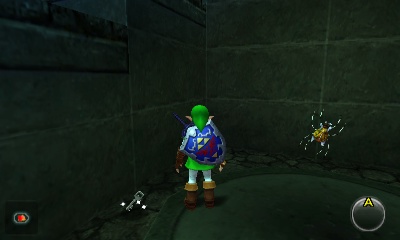 里面有两个宝箱,但其中一个也是隐形的,需要用“真实之眼”才能看到。你会找到一些箭矢和一面盾牌(如果你的盾牌被Like-Like吃掉了的话),否则就是一枚蓝卢比。杀死骷髅蛛并拿到徽章。返回上一个房间。