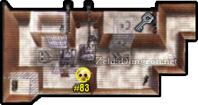 第一个巨型骷髅房间 – 杀死房间里的四只Keese。进入时正上方有两只,它们会碰到附近的蓝色火把变成火焰Keese。建议使用妖精弓快速消灭它们。爬上任意一侧的 ledge,杀死剩下的Keese。