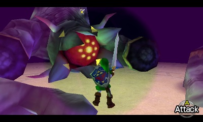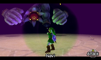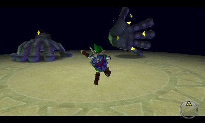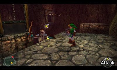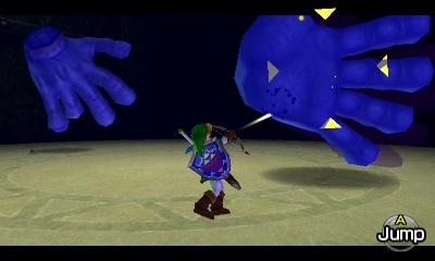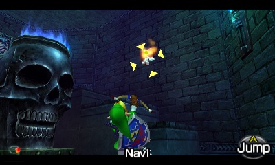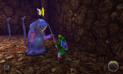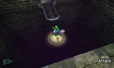 会出现一个Stalfos。你可以利用这个狭小空间的优势,不断刺击它,让它自己掉进无底深渊。同样,你也可以演奏“风暴之歌”召唤一个妖精。